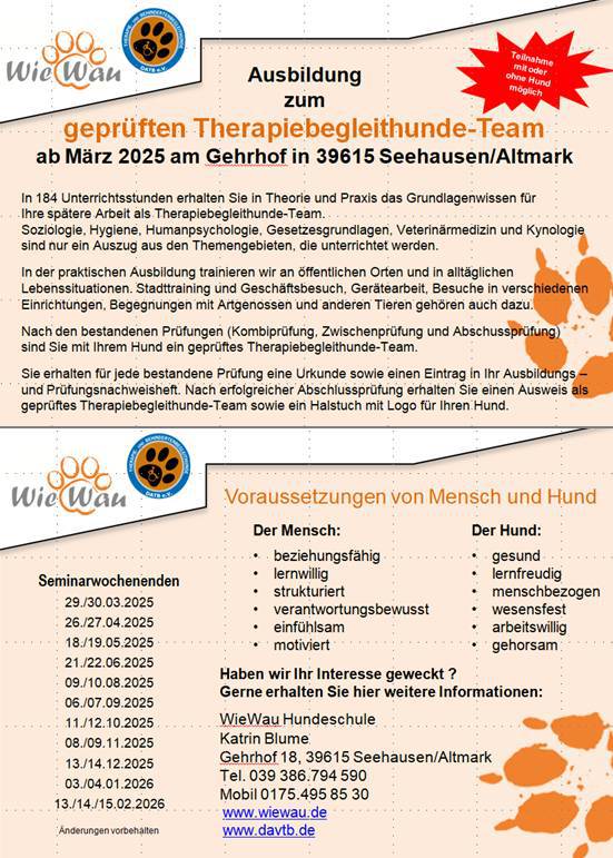 Aktuelle Informationen zum nächsten Start einer neuen Ausbildungsrunde finden Sie auf der Homepage der Ausbildungsstätte. Für organisatorische Dinge wie die Anmeldung, oder bei Fragen zur Ausbildung, wenden Sie sich gerne telefonisch oder per Mail an die jeweilige Leitung.